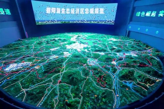 【国内首个水环境生态物理数字沙盘】我 们对传统总规模型进行大胆革新,首次将水环境引入实体模型中,打造国内首个水环境动态物理数字总规沙盘。灯光骤亮,主屏开启。位于主屏下方的水幕倾泻而 下,形成一面生命之水投影墙,主屏连沙盘,同时演绎出“五河入湖”激昂澎湃壮景,通江达海之势震撼人心。38个县域规划区域、两区一带规划等主要内容依次 演绎......最后在人、山、湖、生物、景观等融为一体的场景中结束沙盘的立体演绎。超常规的沉浸式双层水环境模型观演系统将带来独一无二的创新体验, 彰显着鄱阳湖生态经济区作为江西省发展大战略下龙头昂起的重要地位。